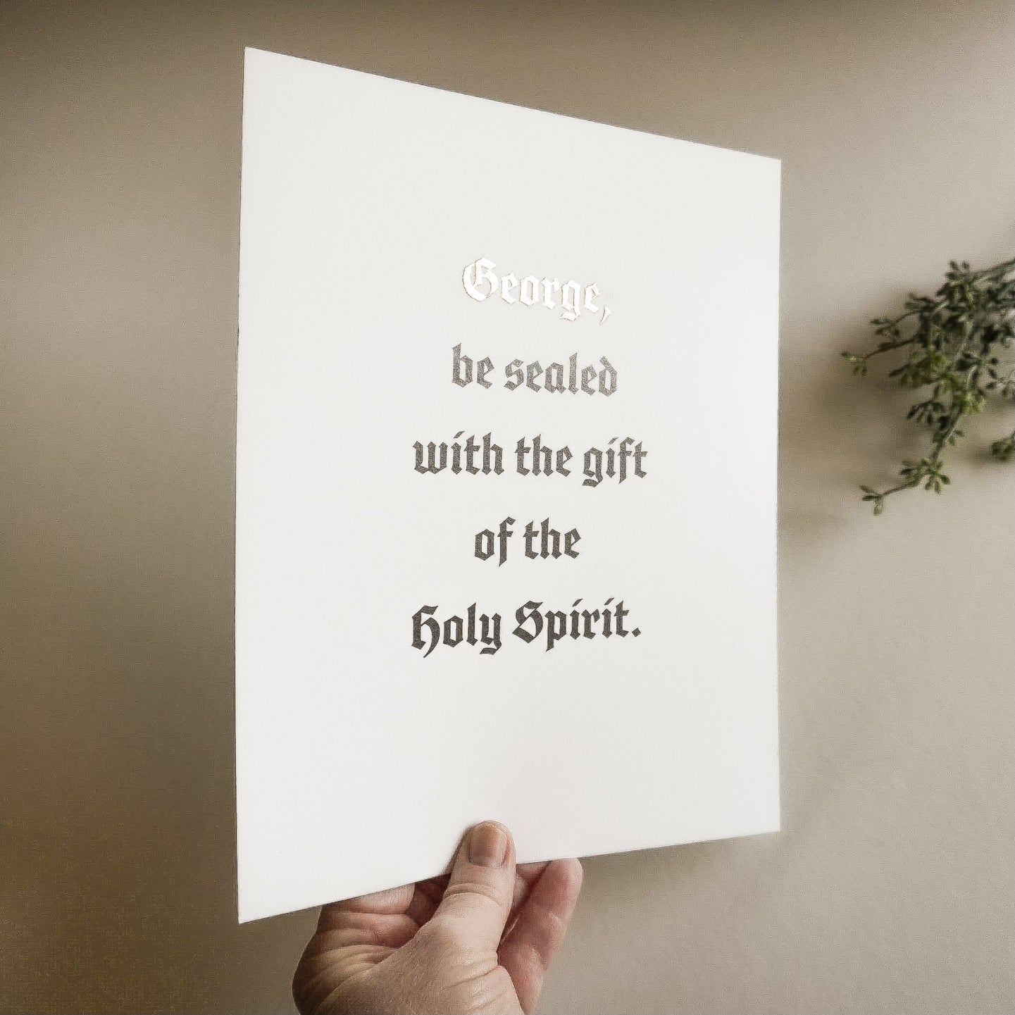 * The name to be used for this print is the same name that the Bishop or Priest addressed them by during the administering of the Sacrament of Confirmation; very often, this is the name of the Saint that they chose as their Confirmation patron. For example, Jennifer's Confirmation name was Francis, so she would enter "Francis" in the text box. If you have any questions, please reach out in Chat or by email; we're here to help!